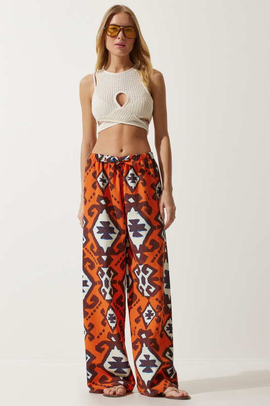Happiness İstanbul Women's Orange Patterned Raw Linen Palazzo Trousers