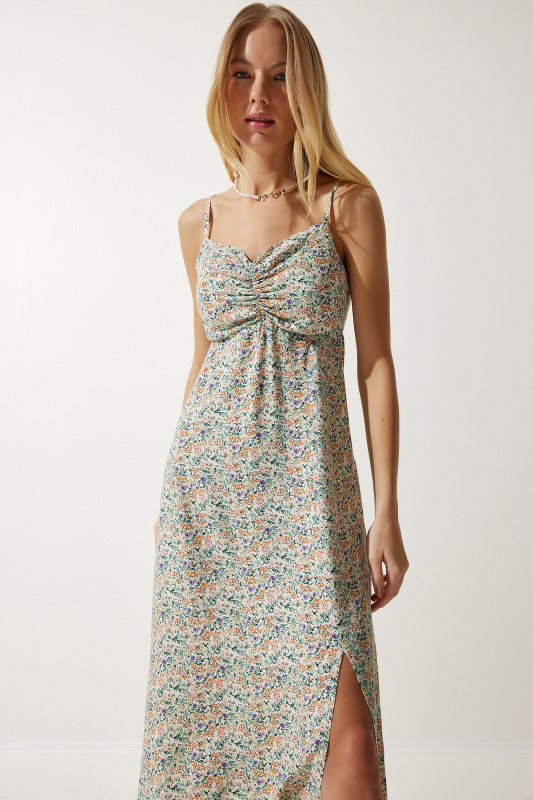 Happiness İstanbul Women's Emerald Green Strappy Summer Pleated Dress