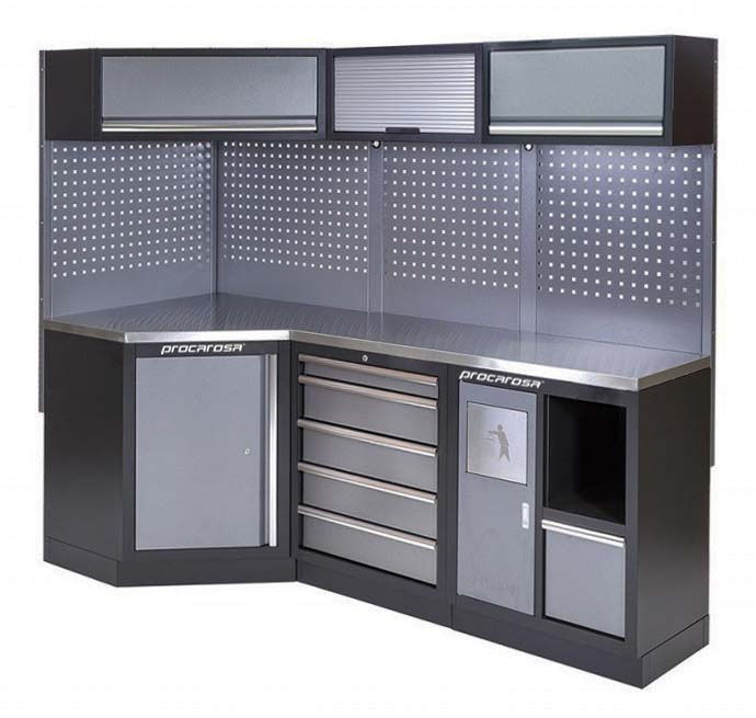 Rohová sestava dílenského nábytku Procarosa PROFI XS-VIII Pracovní deska: nerezová
