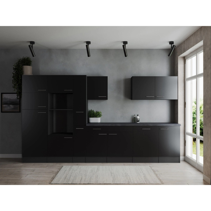 Respekta Kuchyně Oliver černá/žula 340 cm-trouba/skl.deska/dig./myčka/led./mik.
