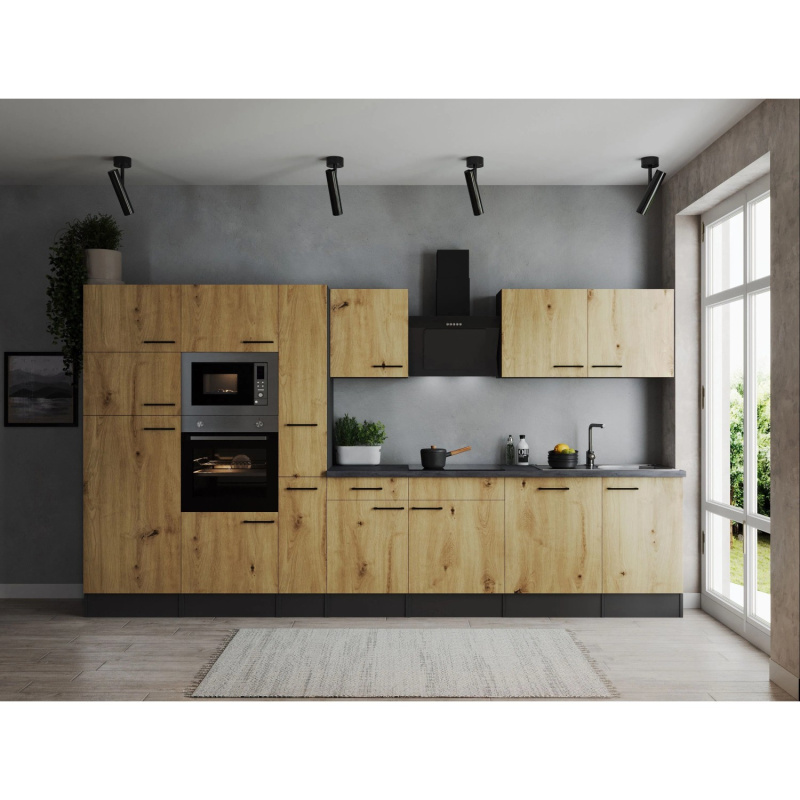 Respekta Kuchyně Oliver dub/žula 370 cm-trouba/skl.deska/dig./myčka/led./mik.