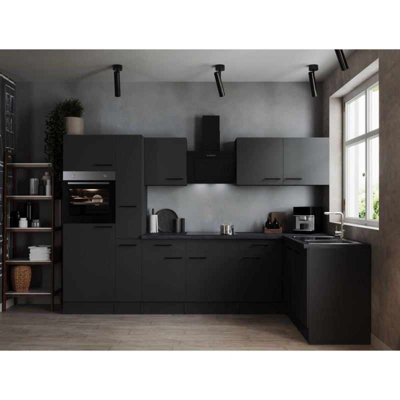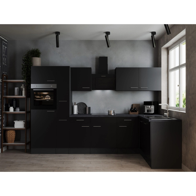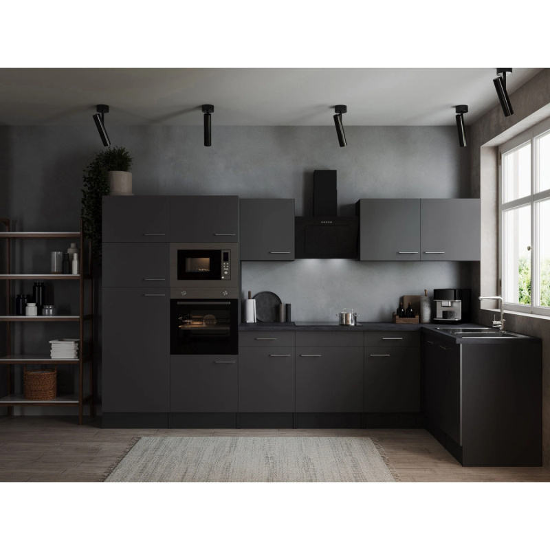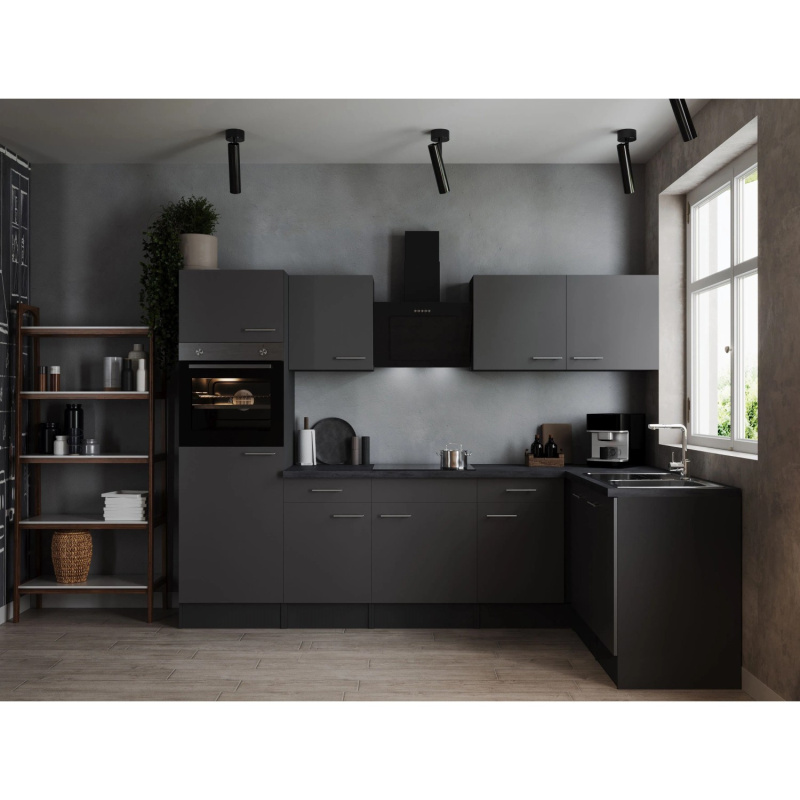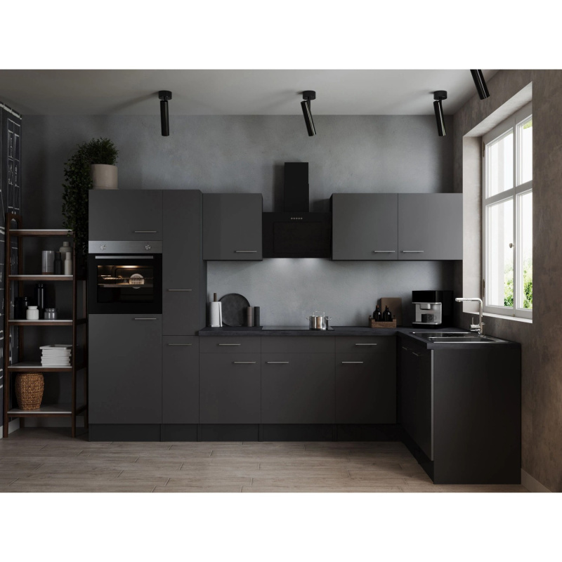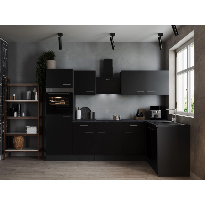 Respekta Kuchyně Oliver L černá/žula 310 cm-trouba/skl.deska/dig./myčka/led.