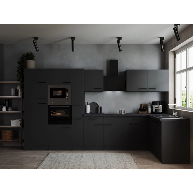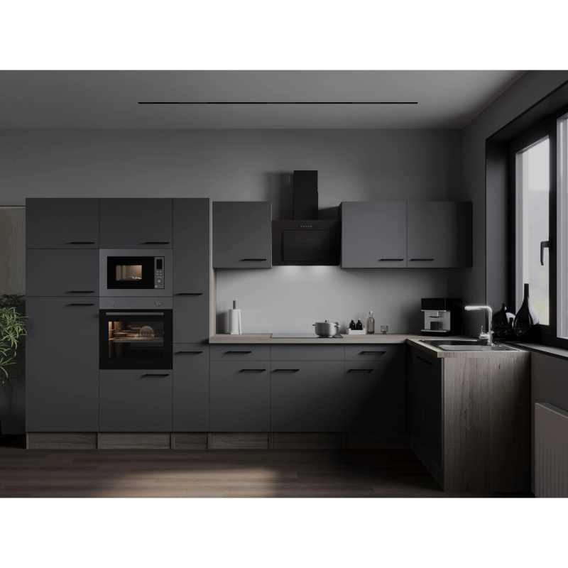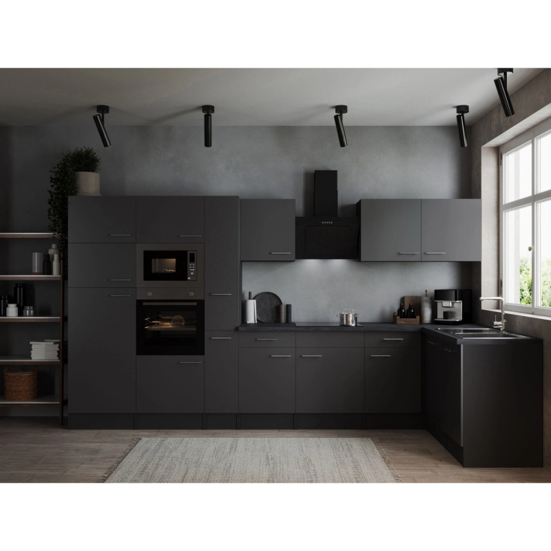 Respekta Kuchyně Oliver L černá/žula 370cm-trouba/skl.deska/dig./myčka/led./mik.