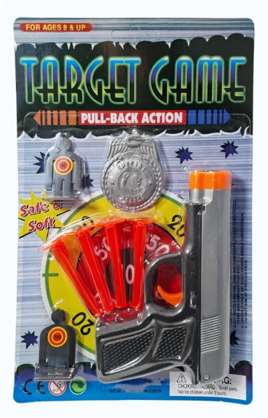 Pistole na pěnové šipky se střeleckým terčem a policejní odznak