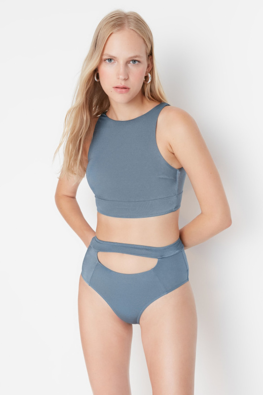 Trendyol Blue Shiny Cut Out Detailed High Waist Bikini Bottoms