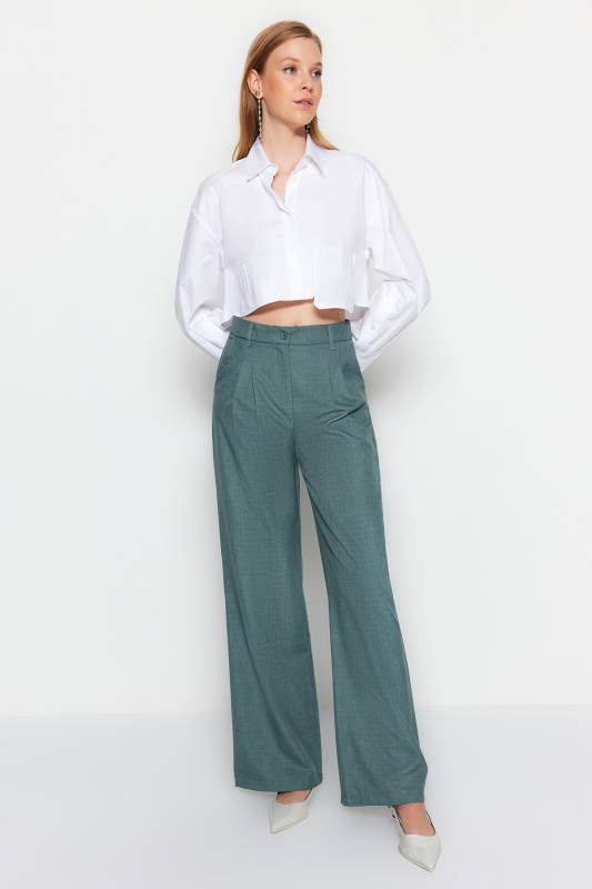 Trendyol tmavě zelené široké plisované tkané kalhoty se širokými nohavicemi