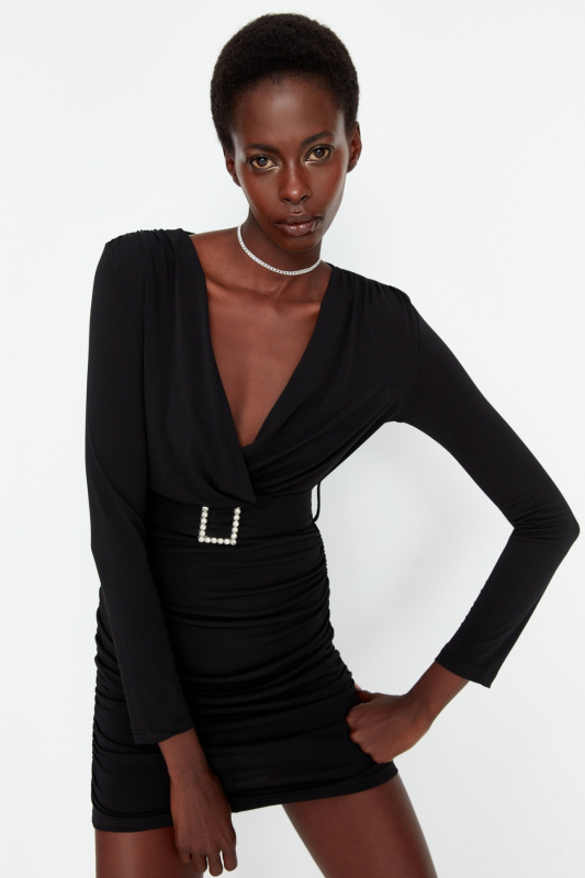 Trendyol Black Body Wrap Košilový límec Mini tkané šaty