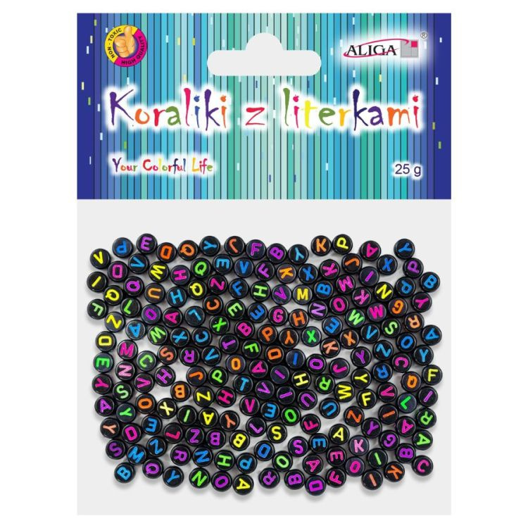 Korálky plastové kulaté, ploché 25g - černé s písmeny, mix