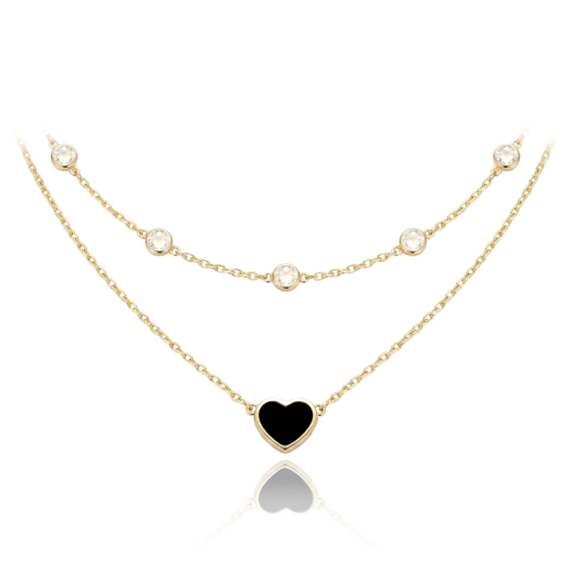 MINET Dvojitý zlatý náhrdelník srdíčko s onyxem a bílými zirkony Au 585/1000
