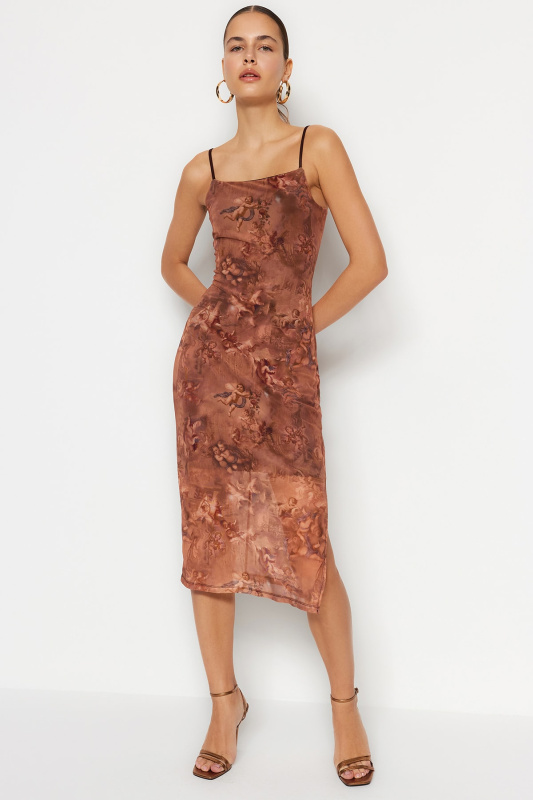 Trendyol Premium hnědé vzorované vypasované midi strečové pletené šaty