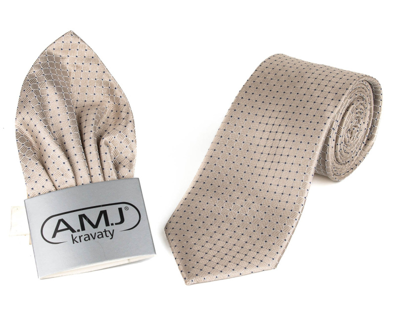 AMJ Kravata pánská s kapesníčkem AMJ kostičkovaná, KK0551, béžová