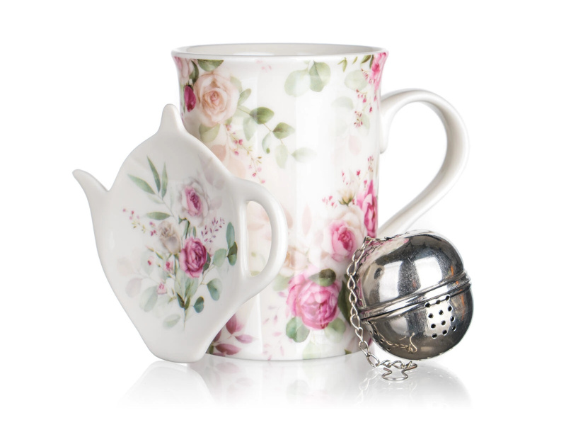 Čajová sada s růžemi 340 ml – keramický hrnek, nerezové sítko a tácek